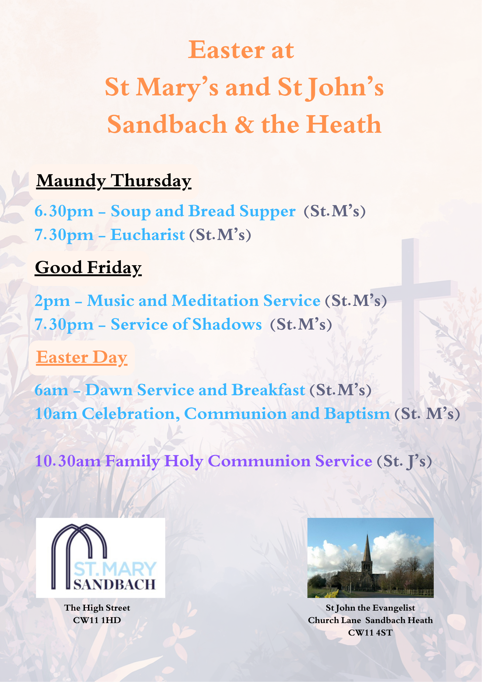 We will be celebrating the joy of Easter in many ways throughout the parish of St Mary and St John Sandbach. The many services are listed in the picture opposite or in the files below. Please do come and join in as much as you can, everyone is welcome.